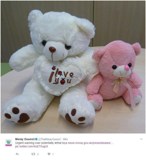 英国默里郡委员会的发言人说:“默里郡的一名幼童被发现脖子上缠绕着从玩具熊里拉出来的电线后,贸易标准局立马针对网上出售的潜在致命毛绒玩具发出一个紧急通告。”